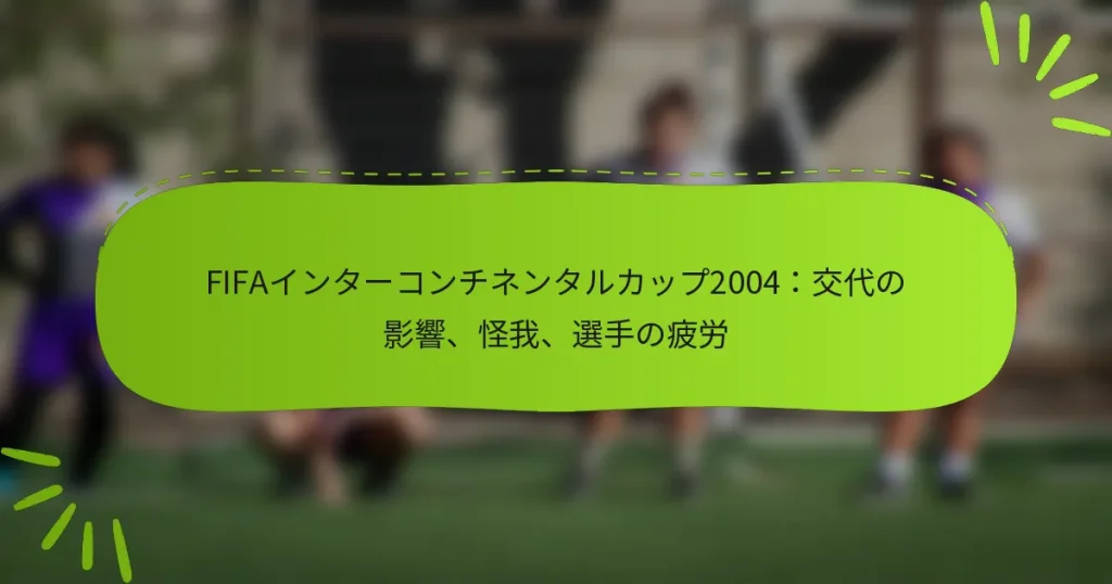 2004年のFIFAインターコンチネンタルカップでは、交代選手が試合のダイナミクスに与える深い影響が示され、コーチたちは戦略的に選手を交代させて疲労を管理し、パフォーマンスを向上させました。怪我も重要な役割を果たし、選手の出場可能性やチーム戦略に影響を与えました。さらに、厳しいスケジュールと身体的な要求が選手の疲労を助長し、個々の選手やチームの結果に影響を与えました。 2004年のFIFAインターコンチネンタルカップにおける交代選手の影響は何でしたか? 2004年のFIFAインターコンチネンタルカップにおける交代選手は、試合のダイナミクス、選手のパフォーマンス、全体的な試合結果に大きな影響を与えました。コーチたちは選手の疲労を管理し、戦術を調整し、チームのパフォーマンスを向上させるために戦略的な交代を利用し、高リスクの試合における意思決定の重要な役割を示しました。 コーチによる戦術的交代の分析 コーチたちは、試合の状況に応じてさまざまな戦術的交代を行いました。例えば、試合の終盤に新しい選手を投入することで、チームは強度を維持し、守備の弱点を突くことができました。この戦略は、疲れた選手をエネルギーとスピードをもたらす選手と交代させることが多くありました。 さらに、交代はフォーメーションを変更したり、専門的なスキルを持つ選手を投入するために頻繁に使用されました。コーチは、ゴールを追い求めるために守備的な選手を攻撃的な選手に交代させたり、逆にリードを固めるために攻撃的な選手を守備的な選手に交代させたりすることがありました。このような戦術的調整は、相手の戦略に対応し、競争のバランスを維持する上で重要でした。 先発選手と交代選手のパフォーマンス比較 パフォーマンス指標は、トーナメント中の先発選手と交代選手の間に顕著な違いがあることを示しました。先発選手は試合のリズムや流れに慣れているため有利でしたが、交代選手は試合の流れを変えることができるエネルギーのバーストを示すことが多くありました。この対比は、選手の質だけでなく、チーム構造内での役割の重要性を強調しました。 交代選手は、相手をプレスしたり攻撃の幅を提供したりするなど、特定の目的を持って任務を与えられることが多かったです。選手の貢献を分析すると、効果的な交代選手が試合に大きな影響を与えることができ、時には重要な瞬間に先発選手を上回ることが明らかになりました。このダイナミクスは、コーチが先発メンバーだけでなく、ベンチ選手の潜在能力も考慮する必要があることを強調しました。 試合結果に対する交代選手の影響 交代選手は、トーナメント中のいくつかのケースで試合結果と直接的な相関関係がありました。ベンチを効果的に活用したチームは、戦術的な優位性を持つことが多く、重要なゴールや守備の安定性をもたらしました。例えば、タイミングの良い交代は勢いを変え、チームが相手の疲労や戦術的な不整合を利用することを可能にしました。 試合の統計分析は、戦略的な交代を行ったチームが有利な結果を得る可能性が高いことを明らかにしました。この傾向は、いつ交代すべきかだけでなく、その選手が試合の最終スコアに与える具体的な影響を理解することの重要性を強調しました。 交代選手のタイミングとその戦略的重要性 交代選手のタイミングは、トーナメント中の効果において重要な役割を果たしました。コーチは、選手の疲労を管理し、影響を最大化するために、60〜70分の間に交代を選択することが多かったです。このタイミングにより、新しい選手が試合に入る一方で、相手は疲れ始めており、利用する機会が生まれました。 さらに、試合の終盤の交代は、相手のリズムを乱したり、重要な瞬間に守備を強化したりするための戦術的な手段として機能することがありました。コーチは、チームの結束を乱すリスクと、試合の戦略的なポイントで新しい選手を投入することによる潜在的な利益とのバランスを取る必要がありました。 重要な試合と交代決定のケーススタディ 2004年のFIFAインターコンチネンタルカップのいくつかの重要な試合は、交代決定の深い影響を示しました。ある注目すべき試合では、遅い交代が試合を決定づけるゴールにつながり、新しい選手が疲れた守備を突くことができることを示しました。このケースは、交代のタイミングだけでなく、投入される選手の特定のスキルセットの重要性を強調しました。 別の試合では、コーチが攻撃的な相手に対抗するために一連の早い交代を行いました。この積極的なアプローチにより、チームはコントロールを取り戻し、最終的に勝利を収めました。このようなケーススタディは、コーチが試合の状況を分析し、結果に大きな影響を与える可能性のある情報に基づいた決定を下す必要性を強調しています。 2004年のFIFAインターコンチネンタルカップで発生した怪我は何でしたか? 2004年のFIFAイ