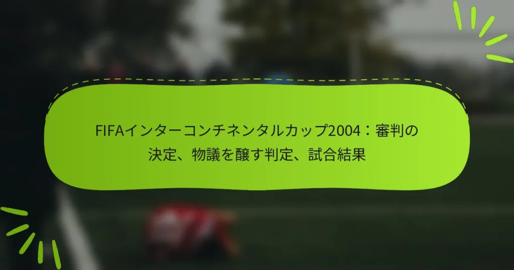 2004年のFIFAインターコンチネンタルカップは、試合の結果を決定づける重要な役割を果たしたいくつかの物議を醸す審判の判定によって特徴づけられた重要なイベントでした。ペナルティ判定やオフサイドの判定を含む重要なコールは、選手、コーチ、ファンの間で議論を引き起こし、最終的には今後の競技におけるチームの戦略や士気に影響を与えました。 2004年のFIFAインターコンチネンタルカップにおける重要な審判の判定は何でしたか? 2004年のFIFAインターコンチネンタルカップでは、試合の結果に大きな影響を与えた重要な審判の判定がいくつかありました。これらの判定は、チームの戦略に影響を与えただけでなく、選手、コーチ、ファンの間で議論を引き起こしました。 重要な審判の判定の概要 試合中、審判はいくつかの重要な判定を下し、試合の流れと最終結果に大きな影響を与えました。特に、物議を醸すペナルティが一方のチームに与えられ、その正当性について激しい議論が交わされました。 前半に与えられたペナルティキックは、ファウルの深刻さについて疑問を呼び起こしました。 選手に対して出されたレッドカードはダイナミクスを変え、チームは戦略を調整せざるを得ませんでした。 いくつかのオフサイド判定が行われ、得点の機会に影響を与えました。 これらの判定は精査され、片方のチームに有利に流れを変えるように見えたため、フィールド上で物議を醸す雰囲気を生み出しました。 試合のダイナミクスに対する審判の判定の影響 審判の判定は試合のダイナミクスに深い影響を与え、両チームのゲームプレイへのアプローチに影響を及ぼしました。早期のペナルティはバランスを変え、一方のチームがより守備的な姿勢を取るきっかけとなりました。 選手が退場させられたことで、チームは大きな課題に直面し、攻撃能力を制限するより慎重な戦略を取ることになりました。この変化は彼らのパフォーマンスに影響を与えただけでなく、試合のリズムも変えました。 試合が進むにつれて、審判の判定は選手の行動に影響を与え続け、緊張感と緊急性が高まりました。選手たちはしばしば判定に感情的に反応し、試合の激しさをさらに助長しました。 審判の判定に対する選手とコーチの反応 選手とコーチは試合中、審判の判定に対して強い反応を示しました。多くの選手が不満を表明し、一部は判定が不当であり、チームのチャンスに悪影響を及ぼすと主張しました。 コーチはペナルティ判定を公然と批判し、それが試合の流れを変えたと主張しました。 選手たちは判定について互いに話し合う姿が見られ、共有された不信感を示しました。 試合後のインタビューでは、選手の中には審判の権威を擁護する者もいれば、特定の判定を非難する者もおり、意見が分かれました。 これらの反応は、関与する感情的な利害を浮き彫りにし、審判の判定がチームの士気や公の認識にどのように影響を与えるかを強調しました。 試合中の審判のパフォーマンスの分析 2004年のFIFAインターコンチネンタルカップにおける審判の全体的なパフォーマンスは、サッカー専門家の間で分析の対象となっています。ある者は審判のコントロール維持能力を称賛する一方で、他の者は判定の一貫性の欠如を指摘しました。 審判のパフォーマンスの重要な側面には、判定のタイミングや選手とのコミュニケーションの明確さが含まれます。一部の判定は過度に寛大であると見なされ、他の判定は厳しすぎると批判されました。 専門家は、このような高リスクの試合のプレッシャーが審判の判断に影響を与え、正確な判定と疑問のある判定が混在する結果につながった可能性があると指摘しました。 サッカーにおける審判の判定の歴史的背景 審判の判定は常にサッカーにおいて重要な役割を果たしており、試合の中で重要な瞬間となることがよくあります。2004年のFIFAインターコンチネンタルカップは、これらの判定が試合の物語をどのように形作るかを思い出させるものです。 歴史的に見て、物議を醸す審判の判定は規則の変更やオフィシエイティングを助けるための技術の導入につながってきました。ゲームの進化は、オフィシエイティングにおける正確性と公正さの必要性を反映しています。 この文脈において、2004年の試合は、公正なプレーを確保するための人間の判断と技術的支援のバランスについての継続的な議論を強調しています。 試合の結果を決定づけた物議を醸す判定は何でしたか? 2004年のFIFAインターコンチネンタルカップは、試合の結果に大きな影響を与えた物議を醸す審判の判定によって特徴づけられました。重要なペナルティ判定、オフサイドの判定、重要なファウルがファンや専門家の間で激しい議論を引き起こし、最終的には結果を形作りました。 異議のあるペナルティ判定の詳細 試合の中で最も物議を醸した瞬間の一つは、多くの人が不当だと考えたペナルティの授与でした。審判の判定は