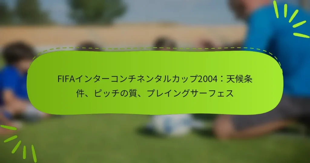 2004年のFIFAインターコンチネンタルカップは、試合のダイナミクスに大きな影響を与えるさまざまな天候条件が特徴でした。天然芝のピッチの質と、気温や湿度といった要因が選手のパフォーマンスや試合全体の流れに重要な役割を果たしました。 2004年のFIFAインターコンチネンタルカップの天候条件はどうだったか? 2004年のFIFAインターコンチネンタルカップは、試合のダイナミクスに影響を与えるさまざまな天候条件の下で行われました。気温、湿度、降水量、風といった要因が試合の進行に大きな役割を果たしました。 試合時の気温 試合中の気温は、摂氏20度前半から中盤(約70-75°F)と報告されました。この範囲は一般的に選手にとって快適とされ、過度の疲労を伴わずに最適なパフォーマンスを発揮できる環境です。 しかし、気温の変動は選手のスタミナや水分補給に影響を与える可能性があります。チームは、試合前や試合中に選手が十分に水分を補給できるように準備を行います。 湿度レベルとその影響 試合中の湿度レベルは比較的高く、選手の発汗や疲労を増加させる可能性があります。高湿度は実際の気温よりも暖かく感じさせ、選手の持久力やパフォーマンスに影響を与えることがあります。 チームは通常、湿度を注意深く監視し、ボールコントロールや選手の敏捷性に影響を与える可能性があるため、選手はピークパフォーマンスを維持するために、より頻繁に水分補給の休憩を取る必要があるかもしれません。 降水量と試合への影響 試合中の降水量は最小限で、乾いたプレイングサーフェスを維持するのに役立ちました。湿った条件は滑りやすいフィールドを引き起こし、選手のトラクションやボールの動きに影響を与える可能性があります。 乾燥した天候は、選手が泥や水たまりの影響を受けずにより自由に動けるため、速いペースの試合を可能にしました。チームはしばしば、プレイングサーフェスの条件に基づいて戦術を調整し、効果を最大化します。 風の条件と選手のパフォーマンス 風の条件は穏やかで、軽い風が吹いていましたが、試合に大きな影響を与えることはありませんでした。強風はボールの軌道を変える可能性があり、パスやシュートをより難しくします。 選手は風の強い条件で技術を調整するように訓練されていますが、この試合では強風がなかったため、より正確なプレーや戦略を効果的に実行することができました。 歴史的な天候データの比較 過去のインターコンチネンタルカップと比較すると、2004年の天候は比較的穏やかでした。歴史的データによると、より暑いまたは湿度の高い条件で行われた試合は、選手の疲労によりペースが遅くなる傾向があります。 過去の天候条件を分析することで、チームは将来の試合に向けてより良い準備ができ、潜在的な天候関連の課題を考慮した戦略を開発することができます。2004年の試合は、好条件の天候がプレーの質を向上させることを思い出させるものでした。 ピッチの質は試合にどのように影響したか? ピッチの質は、FIFAインターコンチネンタルカップ2004の試合に大きな影響を与え、選手のパフォーマンスや試合全体のダイナミクスに影響を及ぼしました。適切に管理されたピッチはプレーを向上させる一方で、悪い条件は怪我を引き起こし、試合の結果に影響を与える可能性があります。 ピッチに使用された芝の種類 FIFAインターコンチネンタルカップ2004のピッチには、耐久性があり重い足の交通に耐えることができるバermudaグラスが使用されました。この種類の芝は、耐久性と摩耗後の迅速な回復力から、温暖な気候で一般的に使用されます。 バermudaグラスは、速いペースのプレーを支える堅固な表面を提供しますが、最適な状態を維持するためには一貫したメンテナンスが必要です。芝の種類の選択は、さまざまな天候条件下でのピッチのパフォーマンスに重要な役割を果たします。 試合前のメンテナンス作業 試合前に、ピッチは刈り込み、水やり、エアレーションを含む広範なメンテナンスを受けました。これらの作業は、芝が健康であり、プレイングサーフェスが平坦であることを確保するために不可欠です。 グラウンドキーパーは、イベントの数日前からピッチを注意深く監視し、天気予報に基づいて水やりのスケジュールを調整し、表面が乾燥しすぎたり泥だらけになったりしないようにします。この積極的なアプローチは、高品質なプレイングサーフェスを維持するのに役立ちます。 ピッチの状態(乾燥、湿潤、泥だらけ) 試合中のピッチの状態は主に乾燥しており、速いゲームを可能にしました。しかし、選手が頻繁に接触するエリアでは、表面に摩耗の兆候が見られる瞬間もありました。 乾燥したピッチはボールの動きを向上させることができますが、選手が足を滑らせると怪我のリスクが増加する可能性があります。ピッチを乾燥させるためのメンテナンスチームの努力は、プレーを妨げる泥の部分を防ぐ上