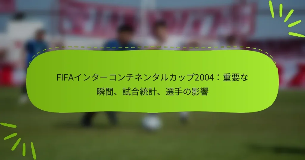 2004年のFIFAインターコンチネンタルカップでは、ヨーロッパと南アメリカのチャンピオン同士のスリリングな対戦が繰り広げられ、試合を定義する重要な瞬間が数多くありました。決定的なゴール、物議を醸す判定、情熱的なファンの応援が交錯し、両チームの競争心を際立たせました。個々の選手のパフォーマンスも重要な役割を果たし、試合の結果に影響を与え、トーナメントの遺産に永続的な影響を残しました。 2004年のFIFAインターコンチネンタルカップの重要な瞬間は何でしたか? 2004年のFIFAインターコンチネンタルカップでは、試合の結果を形作るいくつかの重要な瞬間がありました。重要なゴール、物議を醸す判定、情熱的なファンの反応が、ヨーロッパと南アメリカのチャンピオン同士の記憶に残る対戦に寄与しました。 試合の重要な出来事の概要 試合は2004年12月14日に日本の横浜で行われ、UEFAチャンピオンズリーグの優勝チームであるポルトがコパ・リベルタドーレスのチャンピオンであるオンセ・カルダスと対戦しました。試合は接戦となり、両チームが戦術的な強みを発揮しました。ポルトはボールの支配を目指し、オンセ・カルダスはカウンターアタックに焦点を当てました。 試合が進むにつれて緊張感が高まり、試合の流れを左右するいくつかの重要な瞬間が訪れました。前半はゴールなしで終了し、劇的な後半への舞台が整いました。 最終的に、試合は無得点の引き分けの後、PK戦で決着がつき、両チームの守備力が際立ちました。この結果はトーナメントの歴史において重要な瞬間を意味しました。 重要なゴールと転機 試合は0-0で終了したものの、PK戦では選手たちがプレッシャーの中で冷静さを保たなければならない重要な瞬間がありました。 ポルトのゴールキーパー、ヴィトール・バイアは2本のPKをセーブし、チームに有利な流れをもたらしました。 オンセ・カルダスはレギュラータイム中に得点のチャンスがありましたが、決められず、最終的にPK戦での自信に影響を与えました。 レギュラータイム中のゴールの欠如はPK戦をさらに重要なものにし、神経とスキルの試練となりました。ポルトのプレッシャーへの対処能力がタイトル獲得に決定的な役割を果たしました。 物議を醸す判定とその影響 試合を通じて、特に試合の結果に影響を与えかねない審判の判定に関して、論争の瞬間がありました。一部のファンやアナリストは、特定のファウルが見逃されたと主張し、それが試合のダイナミクスを変える可能性があったと指摘しました。 特に注目されたのは、ポルトに与えられるべきだった可能性のあるPKが認められなかった事件で、選手やサポーターの間で激しい議論が交わされました。このような判定は試合の流れを左右することが多く、今回も例外ではありませんでした。 最終的に、審判の選択は試合のドラマを増しましたが、ゴールがなかったため、これらの物議は最終スコアに直接影響を与えませんでした。 ファンの反応と記憶に残るハイライト 横浜の雰囲気は電気のようで、両チームのファンが情熱的に応援しました。ポルトのサポーターは近いミスごとに喜び、オンセ・カルダスのファンは緊張した瞬間に選手たちを応援しました。 記憶に残るハイライトには、各PKの後の選手たちの感情的な反応が含まれ、高い賭けが関与していることを示しました。スタジアムの緊張感は、ファンがPK戦中に息を呑むほどでした。 ポルトが勝利を収めたとき、祝賀が沸き起こり、ファンは激闘の後の喜びと安堵を表現しました。この試合は結果だけでなく、サポーターの間に生まれた熱狂でも記憶されるでしょう。 試合後の振り返りと分析 試合後、アナリストたちはポルトの勝利がヨーロッパサッカーに与える影響について議論しました。インターコンチネンタルカップの勝利は、ポルトの国際クラブサッカーにおける地位を確固たるものにしました。 批評家たちは、オンセ・カルダスが敗れたにもかかわらず、試合を通じてレジリエンスと戦術的な規律を示したと指摘しました。彼らのパフォーマンスは称賛に値し、ファンやアナリストに強い印象を残しました。 この試合はまた、PK戦のような高圧の状況におけるメンタルの重要性についての議論を引き起こしました。選手やコーチは学んだ教訓を振り返り、今後の類似のトーナメントにおける戦略に影響を与える可能性があります。 2004年のFIFAインターコンチネンタルカップの試合統計は何ですか? 2004年のFIFAインターコンチネンタルカップでは、UEFAチャンピオンズリーグの優勝者とコパ・リベルタドーレスのチャンピオンとの競争が繰り広げられました。試合の統計は、チームのパフォーマンス、選手の貢献、試合全体のダイナミクスに関する重要な洞察を明らかにします。 ボール支配率の統計と傾向 ボール支配は試合で重要な役割を果たし、あるチームが試合の大部分でボールを支配しました。通常、ボール支配率は40%から60%の範囲で