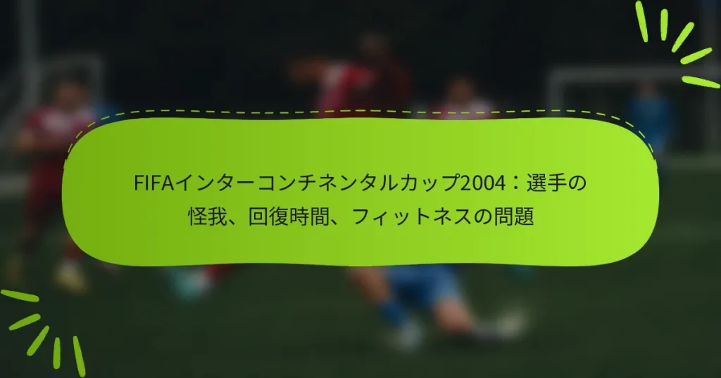2004年のFIFAインターコンチネンタルカップでは、いくつかの重要な選手が怪我をし、それがチームのパフォーマンスに深刻な影響を与えました。これらの怪我は、筋肉の捻挫から靭帯の断裂まで多岐にわたり、回復時間やフィットネスの課題が異なり、最終的には個々のアスリートやチーム全体のダイナミクスに影響を及ぼしました。 2004年のFIFAインターコンチネンタルカップでの主な選手の怪我は何でしたか? 2004年のFIFAインターコンチネンタルカップでは、いくつかの重要な選手が怪我をし、それがチームのパフォーマンスに大きな影響を与えました。注目すべき怪我には、筋肉の捻挫や靭帯の断裂が含まれ、影響を受けたアスリートの回復時間やフィットネスの問題を引き起こしました。 怪我をした選手とその怪我のリスト 選手A – ハムストリングの捻挫 選手B – 足首の捻挫 選手C – 膝の靭帯断裂 選手D – 股関節の引きつり 選手E – 脳震盪 各怪我を取り巻く状況 怪我はさまざまな状況下で発生し、試合の重要な瞬間にしばしば起こりました。選手Aはボールを追いかけてスプリント中にハムストリングを捻挫し、トーナメントの身体的要求を浮き彫りにしました。選手Bの足首の捻挫はタックル中に発生し、攻撃的なプレーに伴うリスクを示しました。 選手Cの膝の靭帯断裂は、方向転換の急激な変化によるもので、高強度のスポーツにおける一般的な怪我の原因です。選手Dは加速を試みている際に股関節を引きつり、限界を超える選手に典型的な状況です。選手Eの脳震盪は衝突によるもので、サッカーにおける安全プロトコルの必要性を強調しています。 怪我がチームパフォーマンスに与える影響 怪我はチームのダイナミクスと全体的なパフォーマンスに深刻な影響を与えました。特に守備の中心的な存在であった選手Cの不在は、相手に利用される隙間を生じさせました。チームはスター選手を欠いた状態で戦略を維持するのに苦労し、士気やパフォーマンスレベルの低下を招きました。 怪我はまた、コーチに戦術的な調整を強いることになり、時には効果的でないフォーメーションをもたらしました。たとえば、選手Aの不在は、チームが経験の少ない控え選手に頼らざるを得なくなり、高いレベルで競争する能力に影響を与えました。全体として、怪我は試合結果に予期しない影響を与えました。 怪我の統計と傾向 怪我の種類 影響を受けた選手数 平均回復時間(週) 筋肉の捻挫 3 2-4 靭帯の断裂 1 6-12 脳震盪 1 1-3 怪我の原因に関する専門家の意見 専門家は、2004年のFIFAインターコンチネンタルカップ中の怪我の高い発生率を、厳しいスケジュールや試合の身体的性質など、いくつかの要因に起因するとしています。移動、高い賭け、競争のプレッシャーの組み合わせは疲労を引き起こし、怪我の可能性を高めることがあります。 さらに、プレイングサーフェスや環境条件も要因として挙げられました。一部の選手はピッチの状態が最適ではなかったと報告しており、これが怪我のリスクを悪化させる可能性があります。専門家は、チームが今後のトーナメントでこれらのリスクを軽減するために、適切なコンディショニングと回復戦略に焦点を当てることを推奨しています。 選手は怪我からどのくらい回復することが期待されましたか? 2004年のFIFAインターコンチネンタルカップで怪我をした選手は、怪我の重症度に応じてさまざまな回復時間を要しました。一般的に、回復期間は数週間から数ヶ月にわたり、怪我の種類や個々の選手の健康状態によって影響を受けました。 各怪我をした選手の回復タイムライン 各選手の回復タイムラインは独自であり、怪我の性質を反映しています。以下は注目すべき例です: 選手A:ハムストリングの捻挫により、回復時間は4-6週間が予想されます。 選手B:膝の手術後、2-3ヶ月で復帰する見込みです。 選手C:軽度の足首の捻挫から1-2週間で回復する見込みです。 選手D:肩の脱臼後、6-8週間の回復が予想されます。 回復時間に影響を与える要因 怪我をした選手の回復時間に大きな影響を与える要因はいくつかあります。これには、怪我の種類や重症度、選手の年齢、怪我前の全体的なフィットネスレベルが含まれます。 さらに、利用可能な医療ケアやリハビリテーション施設の質も回復を早めたり遅らせたりすることがあります。高度な治療オプションにアクセスできる選手は、しばしばより早く回復します。 モチベーションや精神的な回復力などの心理的要因も回復に影響を与えます。ポジティブなマインドセットを維持する選手は、リハビリテーションプロトコルによりよく従う傾向があり、回復期間を短縮する可能性があります。 使用されたリハビリテーションプロトコル 2004年のFIFAインターコンチネンタルカップ中の怪我をした選手のリハビリテーションプロトコルは、怪我の種類に応じて異なりました。一般的な方法には、理学療法、筋力トレーニング、段階的な復帰プログラムが