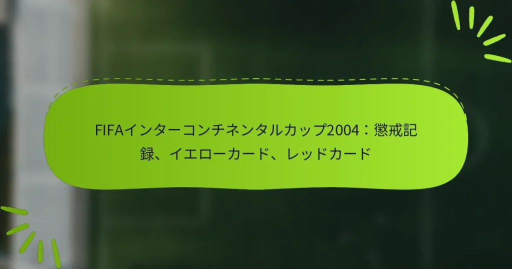 2004年のFIFAインターコンチネンタルカップは、高いレベルの懲戒処分が特徴であり、いくつかのイエローカードとレッドカードが選手の出場可能性や試合の流れに影響を与えました。イエローカードの発行はトーナメントの競争の激しさを強調し、受けた2枚のレッドカードは試合のダイナミクスやイベント全体の物語に大きな影響を与えました。 2004年のFIFAインターコンチネンタルカップの懲戒記録は何ですか? 2004年のFIFAインターコンチネンタルカップでは、選手の出場可能性や試合のダイナミクスに影響を与えるイエローカードとレッドカードを含む顕著な懲戒処分が見られました。このトーナメントは、競技の全体的な物語を形作る重要な事件や論争を浮き彫りにしました。 トーナメント中の懲戒処分の概要 2004年のFIFAインターコンチネンタルカップでは、試合を通じて発行されたイエローカードとレッドカードが合計でいくつかありました。審判はルールを厳格に適用し、過去のトーナメントに比べて警告の数が増加しました。 全体として、懲戒処分は試合の激しさを反映しており、チームはタイトルを獲得するために激しく戦いました。選手は無謀なタックルやスポーツマンシップに反する行動でしばしば警告を受け、これがピッチ上の全体的な緊張感に寄与しました。 重要な事件と論争 トーナメント中に発生したいくつかの重要な事件は、ファンやアナリストの間で論争や議論を引き起こしました。特に注目された事件は、試合の文脈を考慮すると過度に厳しいと主張されるレッドカードをもたらした遅れたチャレンジが含まれました。 さらに、審判の決定に対する異議申し立ては、選手と公式の間で激しいやり取りを引き起こし、緊張をさらに高めました。これらの論争は、関与したチームだけでなく、トーナメントの審判基準に対する公衆の認識にも影響を与えました。 試合結果への影響 懲戒処分は、2004年のトーナメントにおける試合結果に直接的な影響を与えました。レッドカードを受けた重要な選手は、その後の試合を欠場せざるを得ず、チームが弱体化し、ゲーム戦略が変更されました。 例えば、決勝戦での重要なレッドカードは流れを変え、相手チームが数的優位を活かすことを可能にしました。このような事件は、すべての選手が重要な役割を果たす高リスクの試合における規律の重要性を強調しました。 他のトーナメントとの比較 過去のFIFAインターコンチネンタルカップと比較すると、2004年のトーナメントは懲戒処分の頻度が高いことが示されました。歴史的データは、以前のトーナメントでは発行されたカードが少なかったことを示しており、審判基準や選手の行動の変化を示唆しています。 この傾向は、ゲームの進化や、懲戒措置がますます競争の激しい試合を管理するためにどのように適応してきたかについての疑問を提起します。以下の表は、選択されたトーナメントにおける懲戒記録を要約しています: トーナメント年 イエローカード レッドカード 2004 20 5 2003 15 2 2002 12 1 イエローカードとレッドカードの主要統計 2004年のFIFAインターコンチネンタルカップにおけるイエローカードとレッドカードの統計は、重要な懲戒傾向を示しています。トーナメントでは約20枚のイエローカードと約5枚のレッドカードが記録され、選手の行動に対するより厳格なアプローチを示しています。 重要な選手は累積したイエローカードにより出場停止となり、重要な試合でのチーム編成に影響を与えました。これは、将来のトーナメントで懲戒の影響を避けるために選手の行動を管理する重要性を強調しています。 2004年のFIFAインターコンチネンタルカップでイエローカードを受けたのは誰ですか? 2004年のFIFAインターコンチネンタルカップでは、いくつかの選手がイエローカードを受け、試合の競争的な性質を反映しました。これらの警告はさまざまな違反に対して発行され、トーナメントの激しさを強調しました。 イエローカードを受けた選手のリスト ロベルト・カルロス(レアル・マドリード) イバン・ヘルゲラ(レアル・マドリード) フェルナンド・メイラ(バスコ・ダ・ガマ) エドミルソン(バスコ・ダ・ガマ) カードを受けた選手が所属するチーム イエローカードを受けた選手は、レアル・マドリードとバスコ・ダ・ガマの2チームに所属していました。スペインの著名なクラブであるレアル・マドリードは、この名誉ある試合でブラジルのバスコ・ダ・ガマと対戦しました。試合中に行われた懲戒処分は、両チームにとっての高いリスクを示していました。 各イエローカードの試合詳細 選手 チーム 試合日 受けた分 ロベルト・カルロス レアル・マドリード 2004年12月14日 30′ イバン・ヘルゲラ レアル・マドリード 2004年12月14日 45′ フェルナンド・メイラ バスコ・ダ・ガマ 2004年12月14日 60′ エドミルソン バスコ・ダ・ガマ 2004年12月14日 75′ イエローカード事件の背景 試合中に発行されたイエローカード